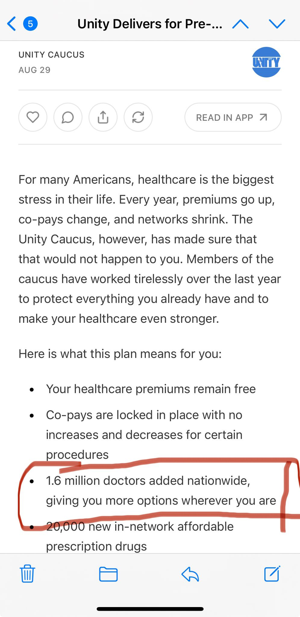 Worse, Unity amended it. First, they gave lip service to opposing Medicare Advantage. Again, they continue to do nothing to ensure that. Second, they created this phony-baloney rubber stamp health committee, simply to make it appear Unity was not making unilateral decisions.