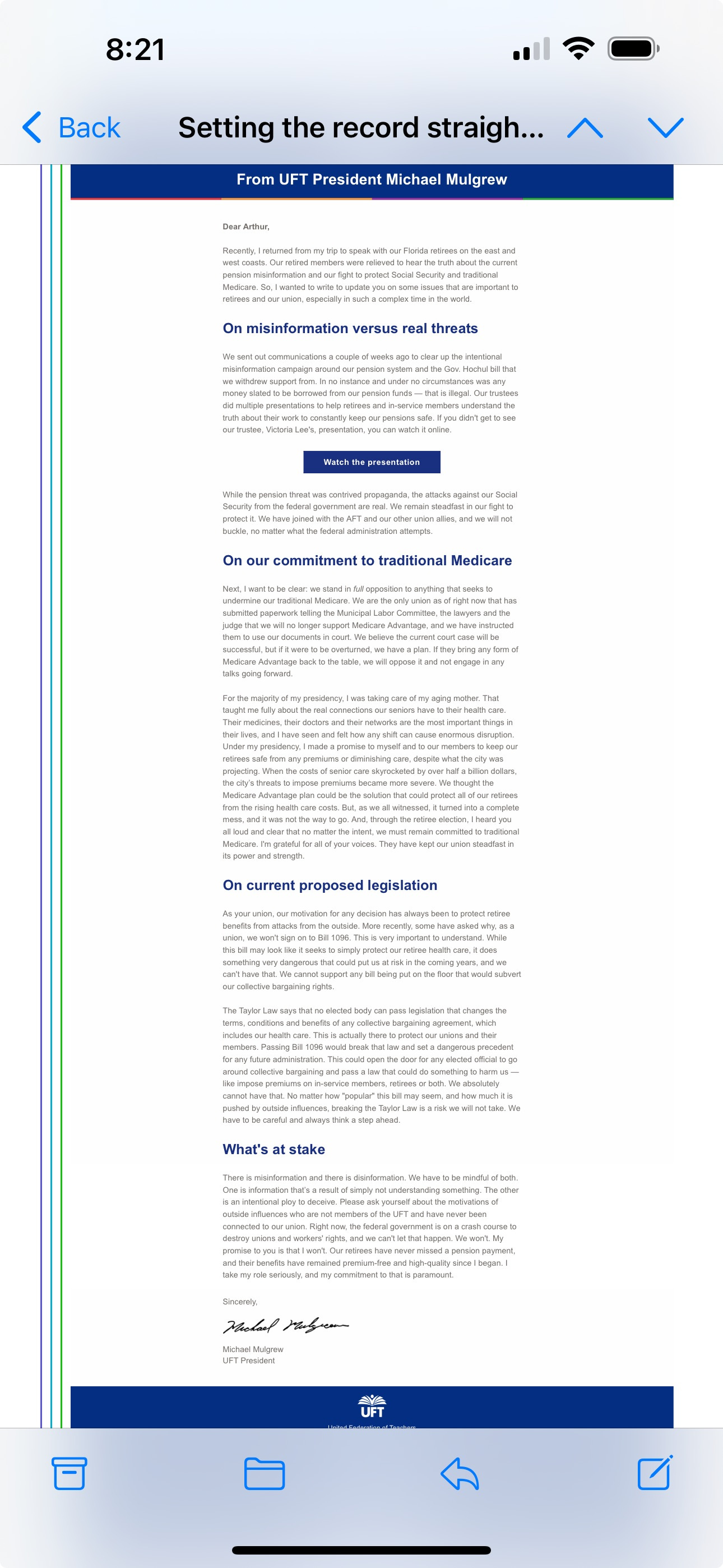 Please ask yourself about the motivations of outside influences who are not members of the UFT and have never been connected to our union. They can’t email you and pretend they aren’t campaigning for re-election, but I can. I will do or say absolutely anything to retain my highly paid gig, and have people on staff who can write stuff like this I can sign my name to. Remember, I’m the one who moved to dump retirees into Medicare Advantage, and I’m the one who imposed co-pays on your Medigap plan.