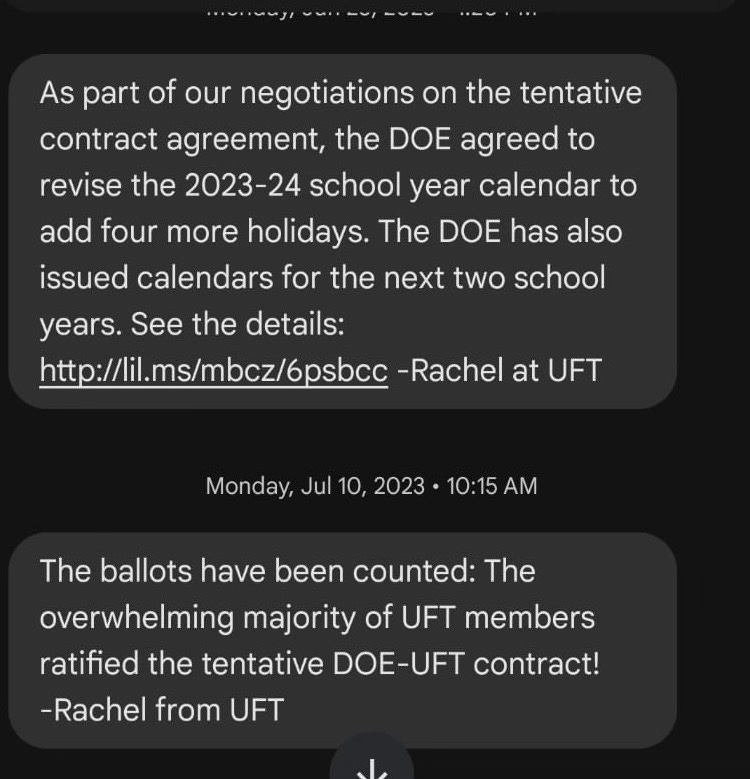 So the holidays were added, and the calendars were set. The UFT Patronage Cult had access, and announced it to members. Ironically, the very next text celebrated the contract agreement. So here’s a question—if you have a recurring issue with Monday, December 23rd, and you are able to negotiate the calendar, why not just write it into the contract?