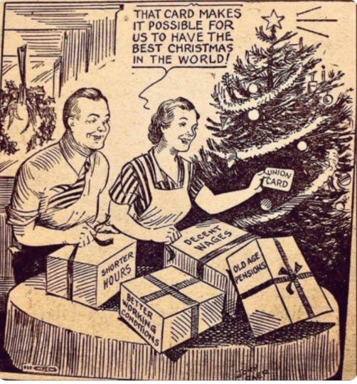 I love the cartoon above. Despite what you may hear, and despite entrenched, self-important bosses, union is a powerful tool for working people. If you wonder where the 5-day week came from, why we have sick days, or why doors aren’t locked and chained when we are at work, it’s because unionists battled for those things.
