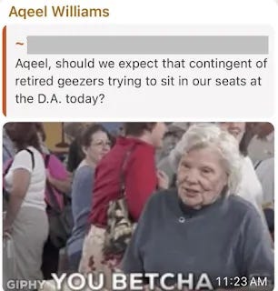 What if I were to tell you that the guy who harassed the member about sitting in the wrong seat was an unelected UFT District Representative, that he made well more than any working teacher, and that during another Delegate Assembly, he chose to ridicule retired delegates with memes exactly like these? What if I told you he saw fit to share them with chapter leaders (for whom he was ostensibly setting an example)?